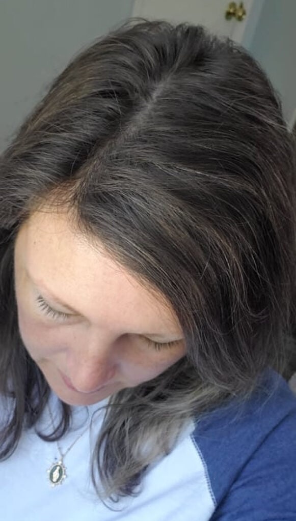 I held the spray about 5 inches away from my scalp and misted all the most prominent trouble areas. I lifted up a few sections where there was a lot of grey hiding underneath and directed a few more sprays that way. I didn’t go for complete and total coverage because I wanted it to look more natural and still have my highlights peeking out here and there.
