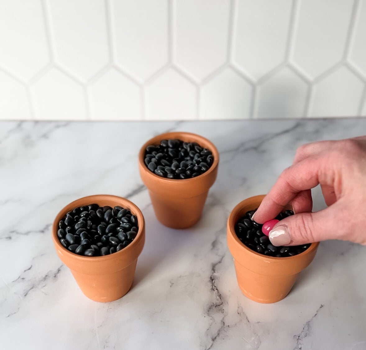 Yes! If you don’t have a good spot outside to plant or the weather isn’t cooperating, you can absolutely make a magic jelly bean garden inside. Just grab a couple small pots and fill with whatever you have on hand like faux moss. I used dry black beans because I had them handy!