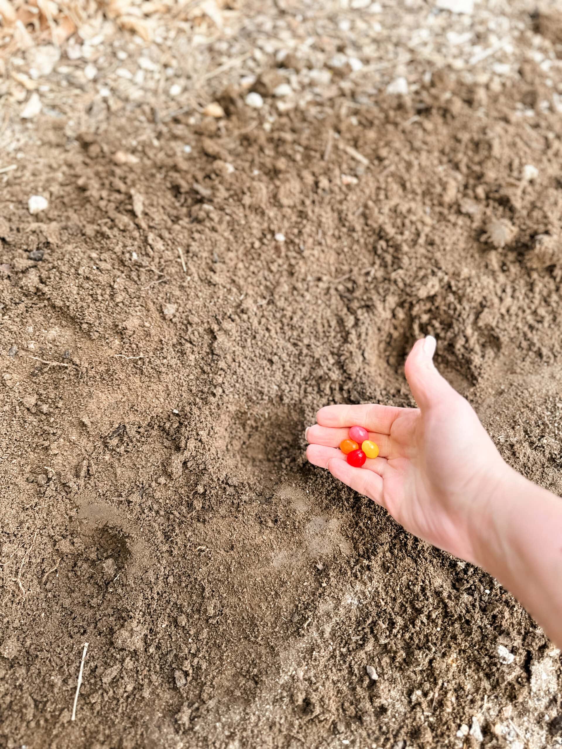 You can do one jellybean per hole, or a few like we did. Drop the beans into the hole and have your kids cover gently with soil.