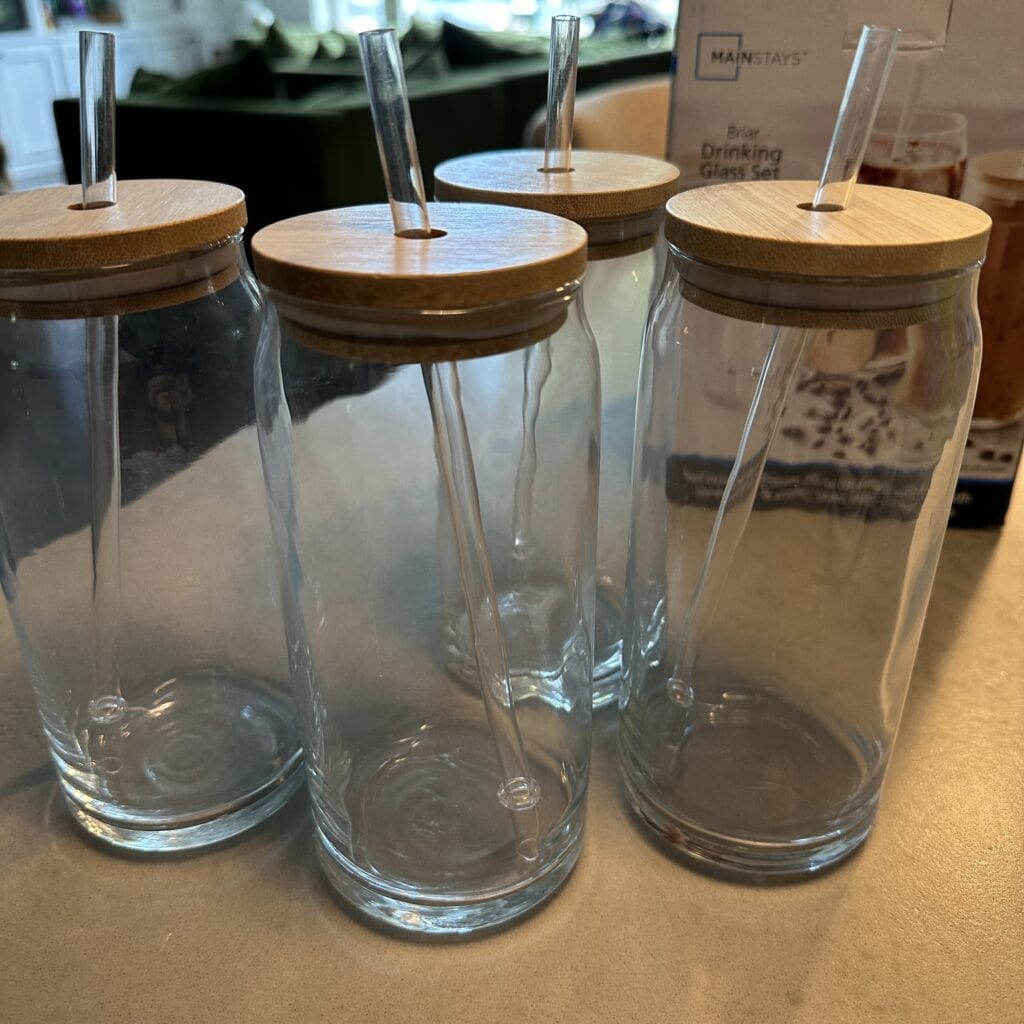 They are glass jars with an acrylic straw and a really nice wooden lid. They keep your drink covered up and are so much fun! If you are looking for a yummy Starbucks drink to try in your new glasses, check out our Starbucks Copycat Drink recipe. You can view all Walmart deals here.
