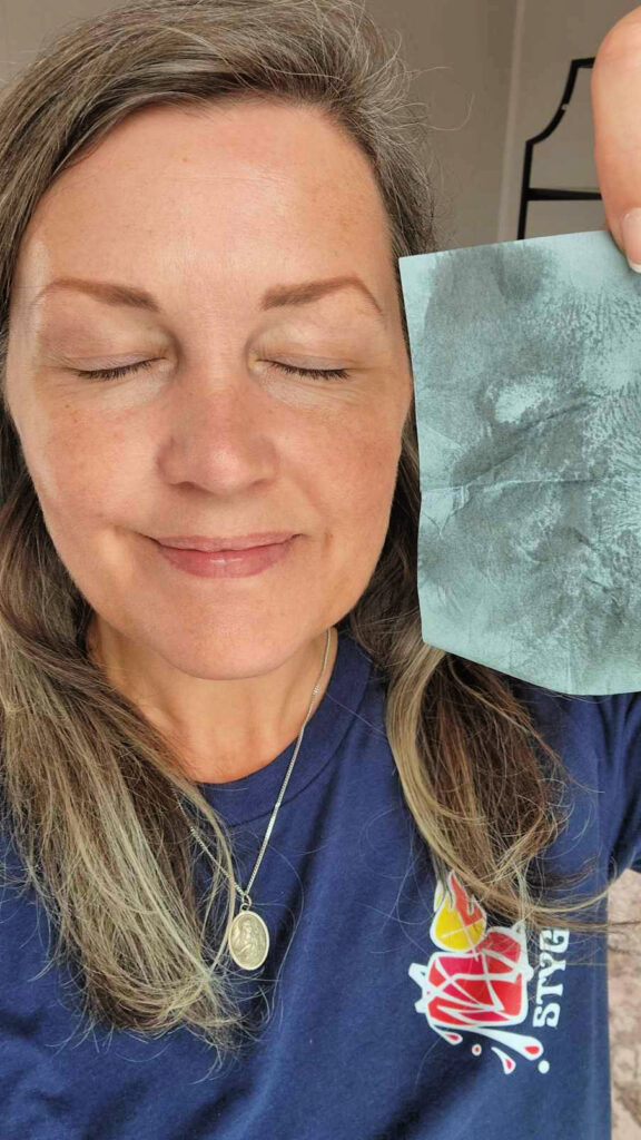 You can see the oil from my nose, eyelids, t-zone and chin has been absorbed into the blotting sheet. I just showered and used toner this morning, but I just have oily skin so these sheets help me keep it looking a little more matte and less greasy. I keep one in my purse, one in my office and one in my makeup kit – so I always have one on hand!
