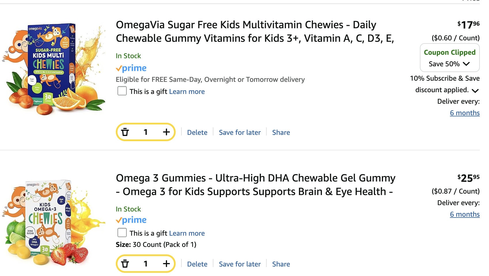 Add OmegaVia Sugar-Free Kids Multivitamin Chewies 30ct – $19.95NOTE – Add both as one-time purchase and then choose subscribe on the checkout page