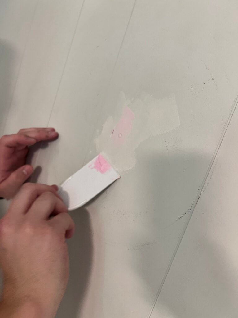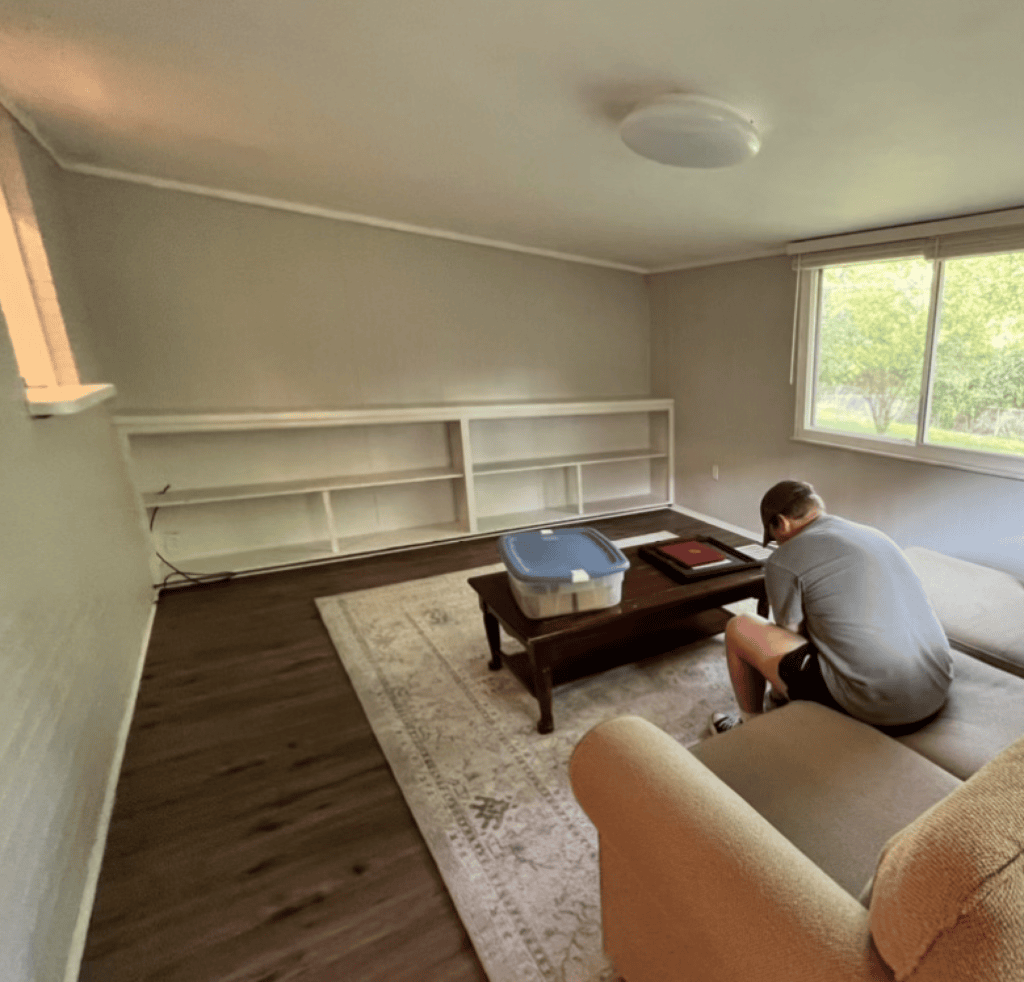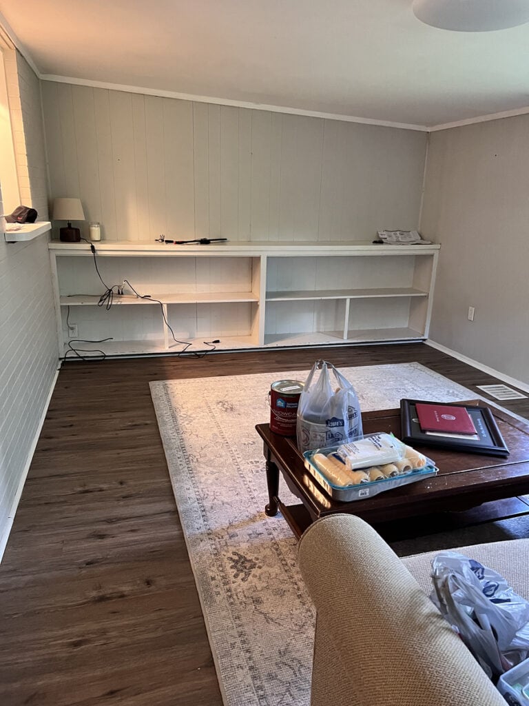 We ran around for two days getting everything he needed, and I promised we’d try to tackle one room in his house while I was there to make him feel like he was home. The house is a 1950s (adorable!) ranch, but in sore need of some TLC. Several rooms have wood paneling that simply need a paint makeover, so we were determined to get it done!