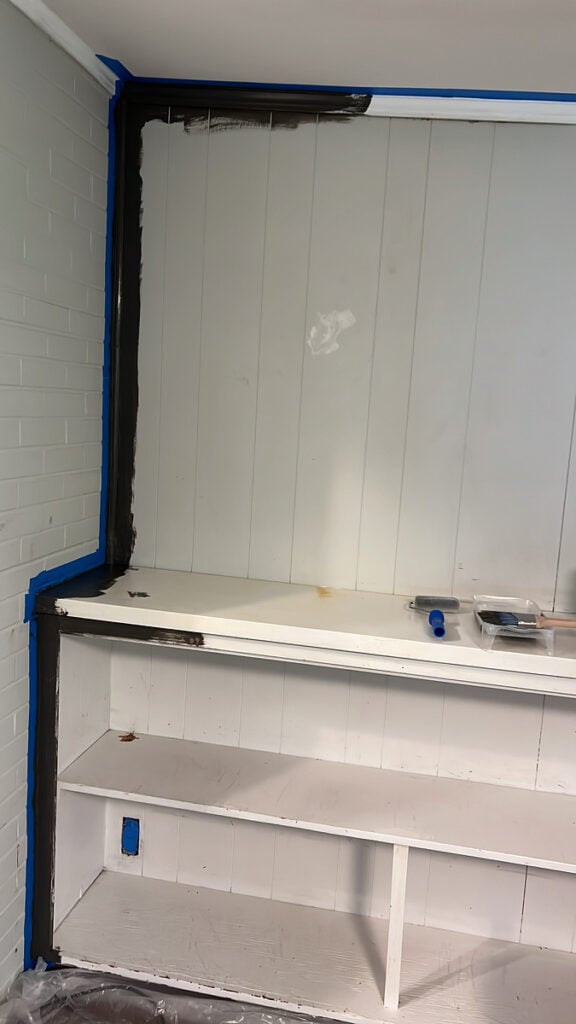 This was the wall after coat #2 while still wet. Don’t get worried if your wood paneling looks inconsistent after painting ~ as the paint dries it will all blend in (if it doesn’t, paint one more coat of paint!)