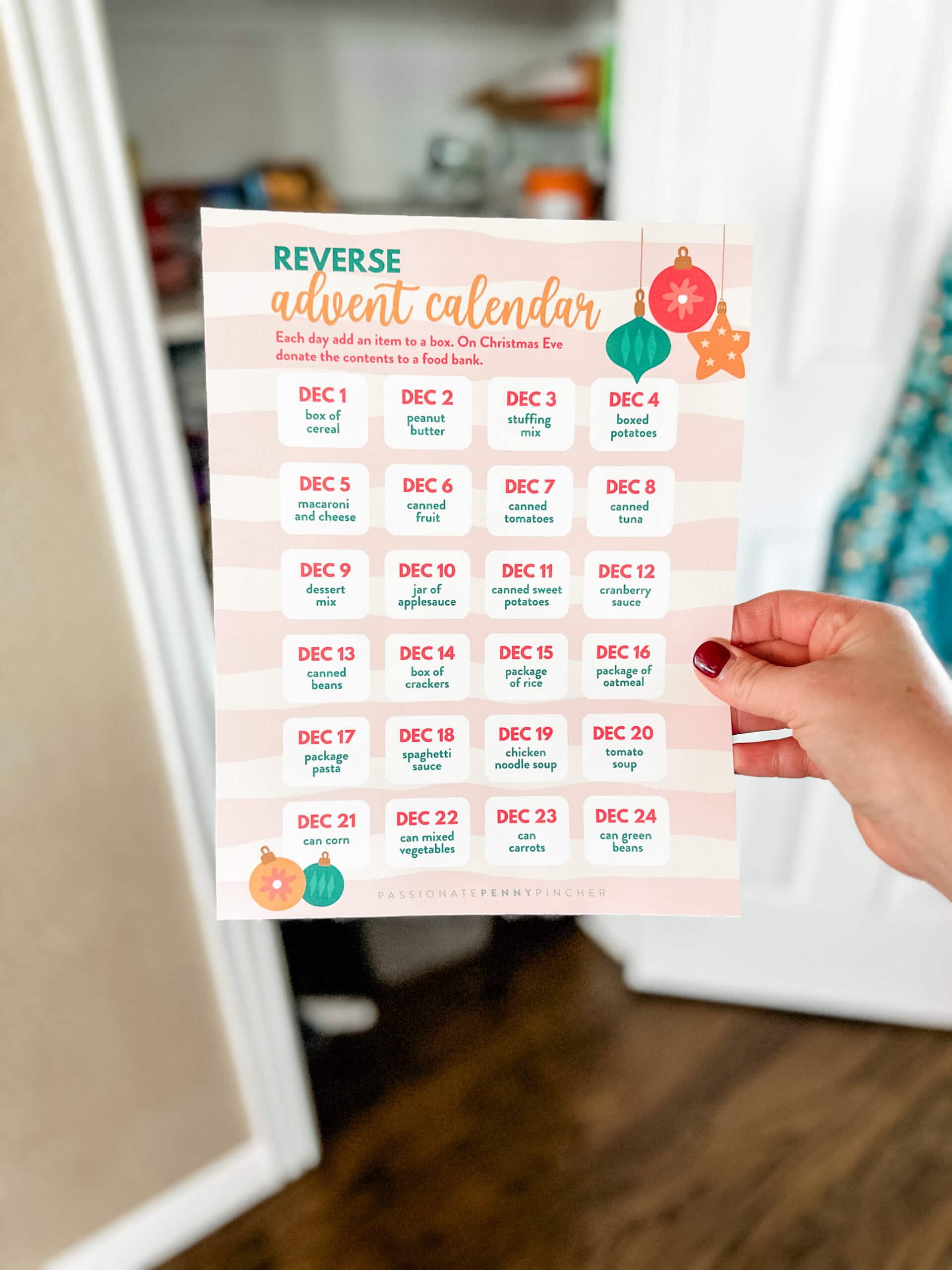 In the spirit of giving and celebrating the true meaning of Christmas, for a Reverse Advent Calendar your family can collect one (new, unexpired) food item from your pantry every day.