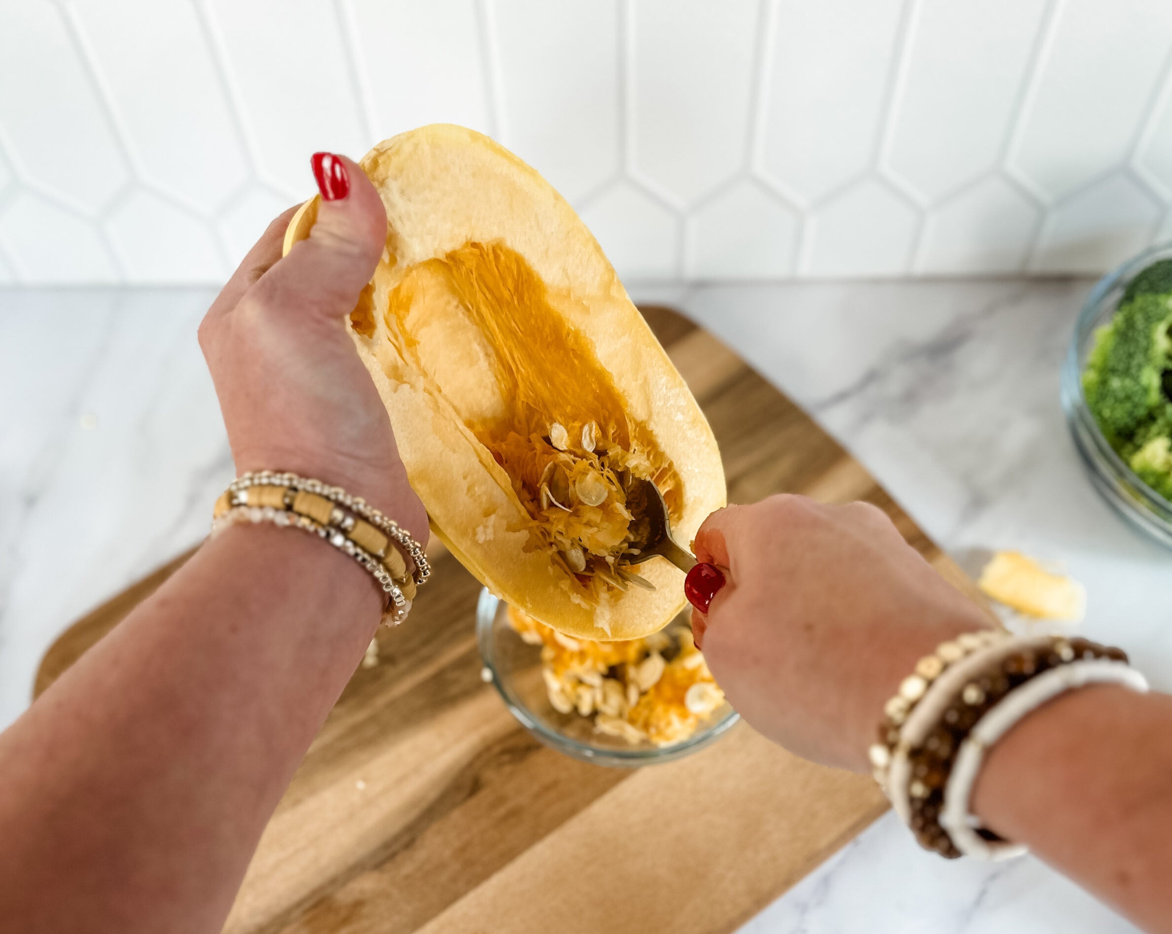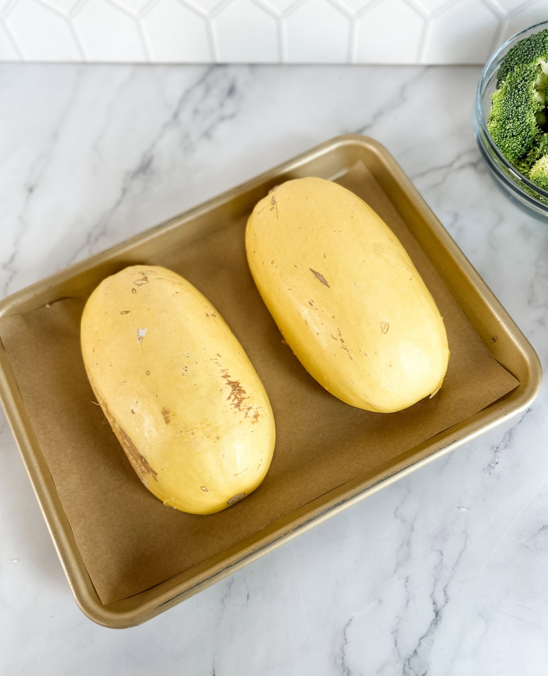 - Preheat oven to 400℉. Slice spaghetti squash lengthwise, and scoop out seeds.