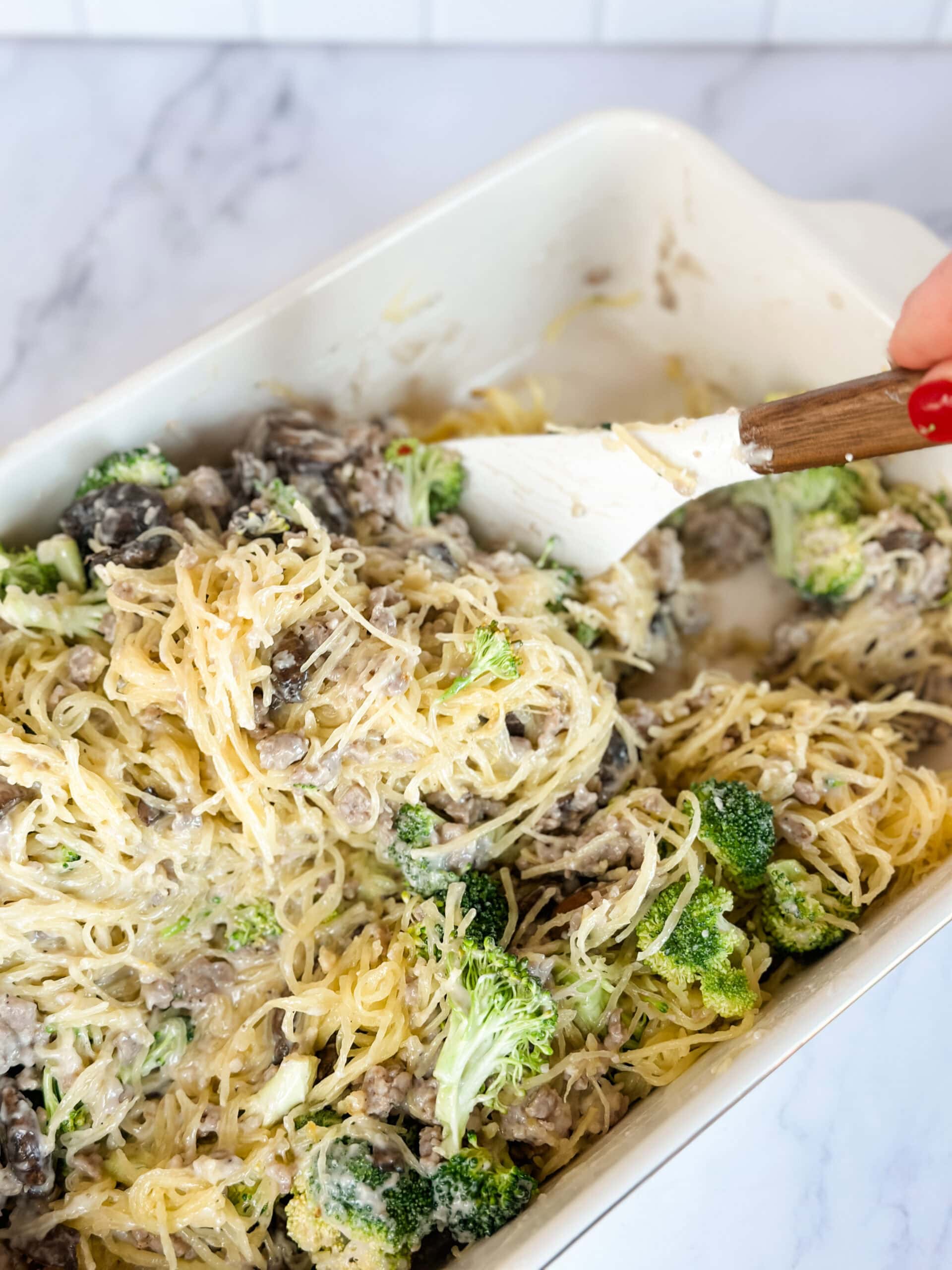 Once the squash is cooled, use a fork to scrape out the “noodles” into a casserole dish. Stir in cooked sausage, broccoli florets, and creamy garlic sauce. Mix everything together.