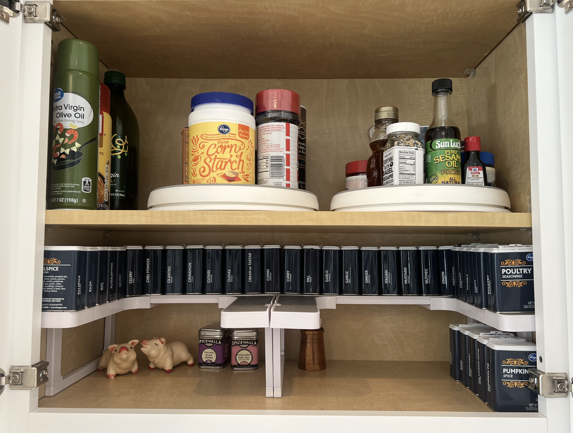 I have used turn-tables for my spices many years now, and alphabetizing spices to keep order. I even found a 2-tier one that holds the shorter containers, and makes life easier.