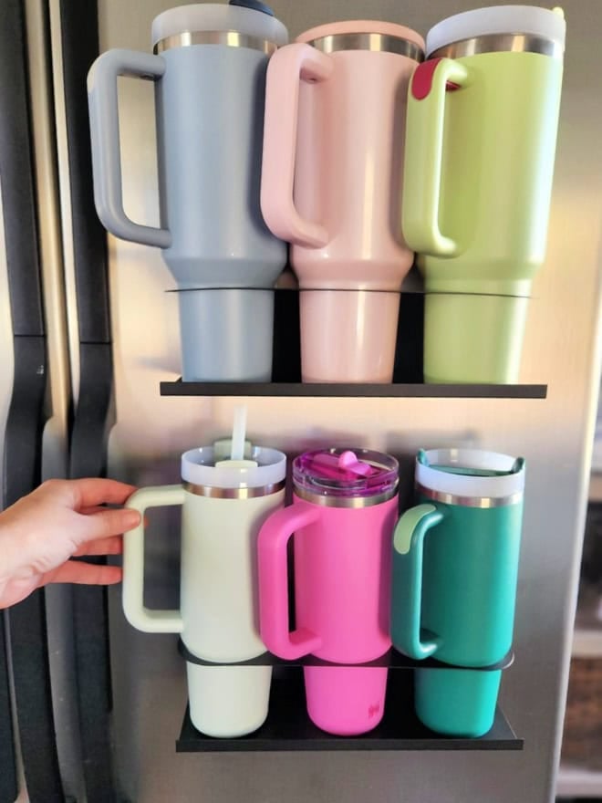 Another option for holding a TON of tumblers (this one is for the true collector!) is this Over the Door Storage with 15 Large Pockets. While there are a lot of over-the-door storage pocket options – this one is made with the Stanley 40oz Tumblers in mind – and according to several reviewers, fits them perfectly. Plus, it’s under $16!