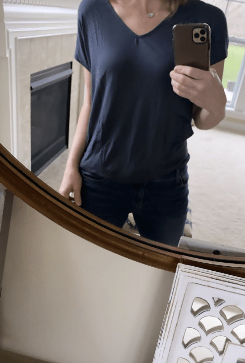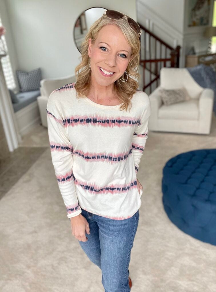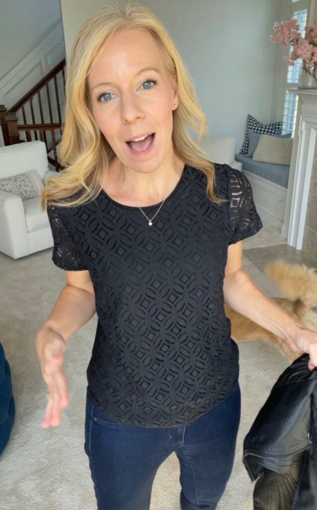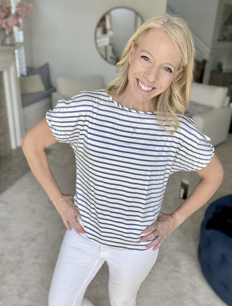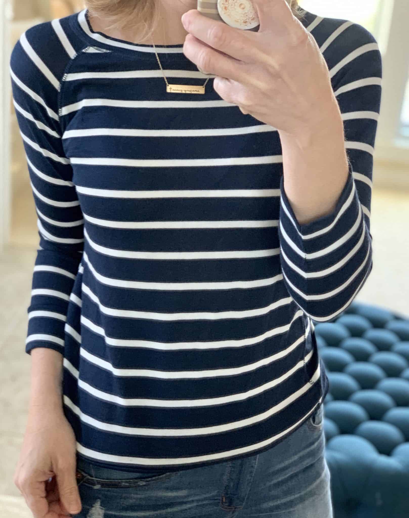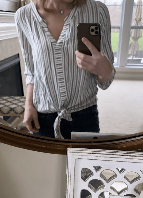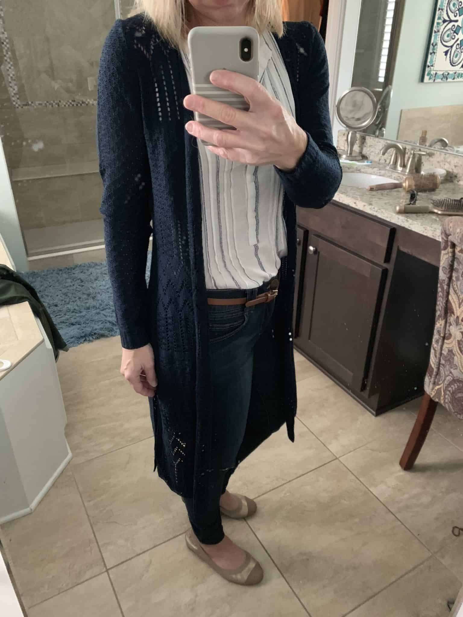 - Try things different ways. IT TOTALLY MAKES A DIFFERENCE that I try things on in front of a few hundred folks on Facebook Live. 🙂 For example today, someone mentioned a way to wear the navy top a way that I would NEVER have kept (I wouldn’t have kept the navy top because I didn’t know to tuck it in and belt it, but it looks so stinkin’ cute done the right way!) Definitely watch those Pinterest boards too for style because that helps a ton!