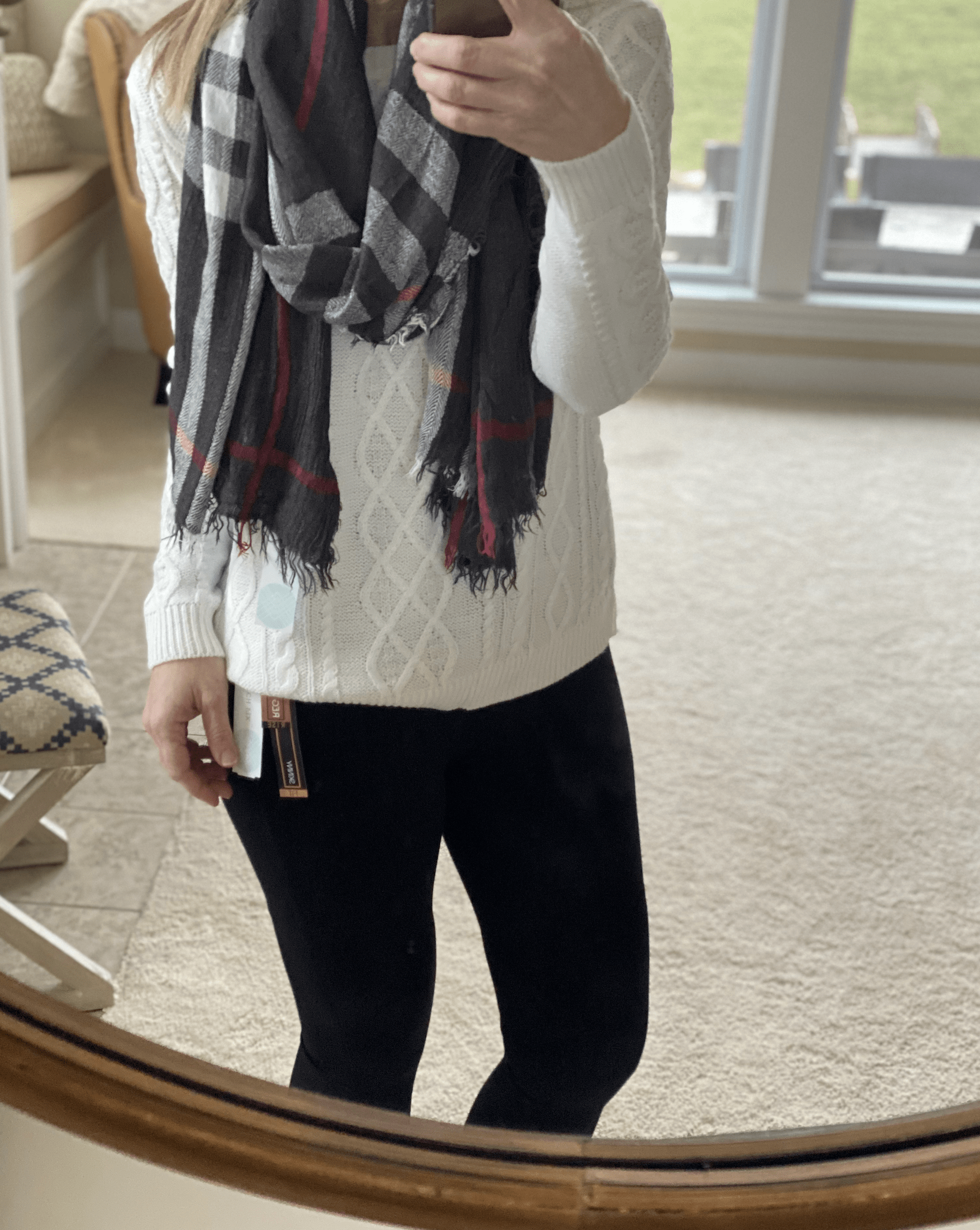 Honestly, I don’t have a whole lot of time for shopping, and definitely needed the pants (and the plaid shirt and sweater are just so cozy that I really want to keep them!) I’m on the fence about the scarf and vest, but figure I can gift them (or have two girls who can wear them . . . ) so I’m thinking I may keep it all this month.