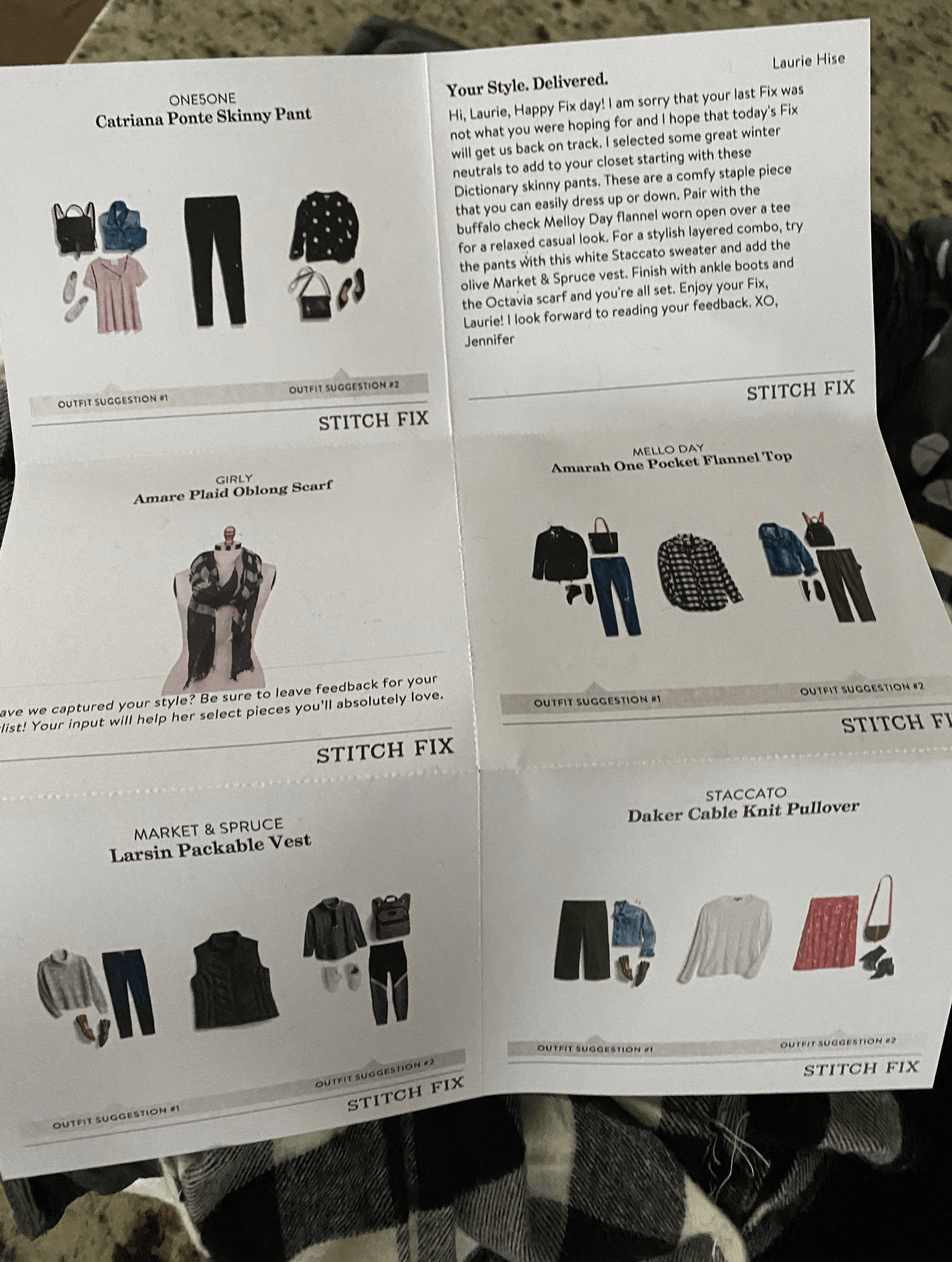 I love Stitch Fix! I’m one of the rare woman who hate shopping even if I had the time. This works out well for me and the stylist is worth the expense. Every so often I’ll get to go through various articles of clothing to say if I like something or not, I have their app so it makes it real easy. I haven’t sent anything back since my first few boxes. Everything fits perfectly! I’m addicted but had to control myself so I reduced the shipments to about four per year. If I want or need an extra shipment I just order. I did this for Christmas! So happy with their high quality product. I totally agree they have the best jeans ever! So smooth and comfortable you could sleep in them! And I never thought I’d ever wear a pair of jeans, I have several now. It’s an awesome service and worth it! The extras are great too! I’ve replaced my underwear, socks and something called a Hue which is a long tight fitting cami! So comfortable and work great with dresses or skirts! The socks are so soft! I also treated myself to a pair of pajamas, best pjs ever! My vote is for Stitch Fix!