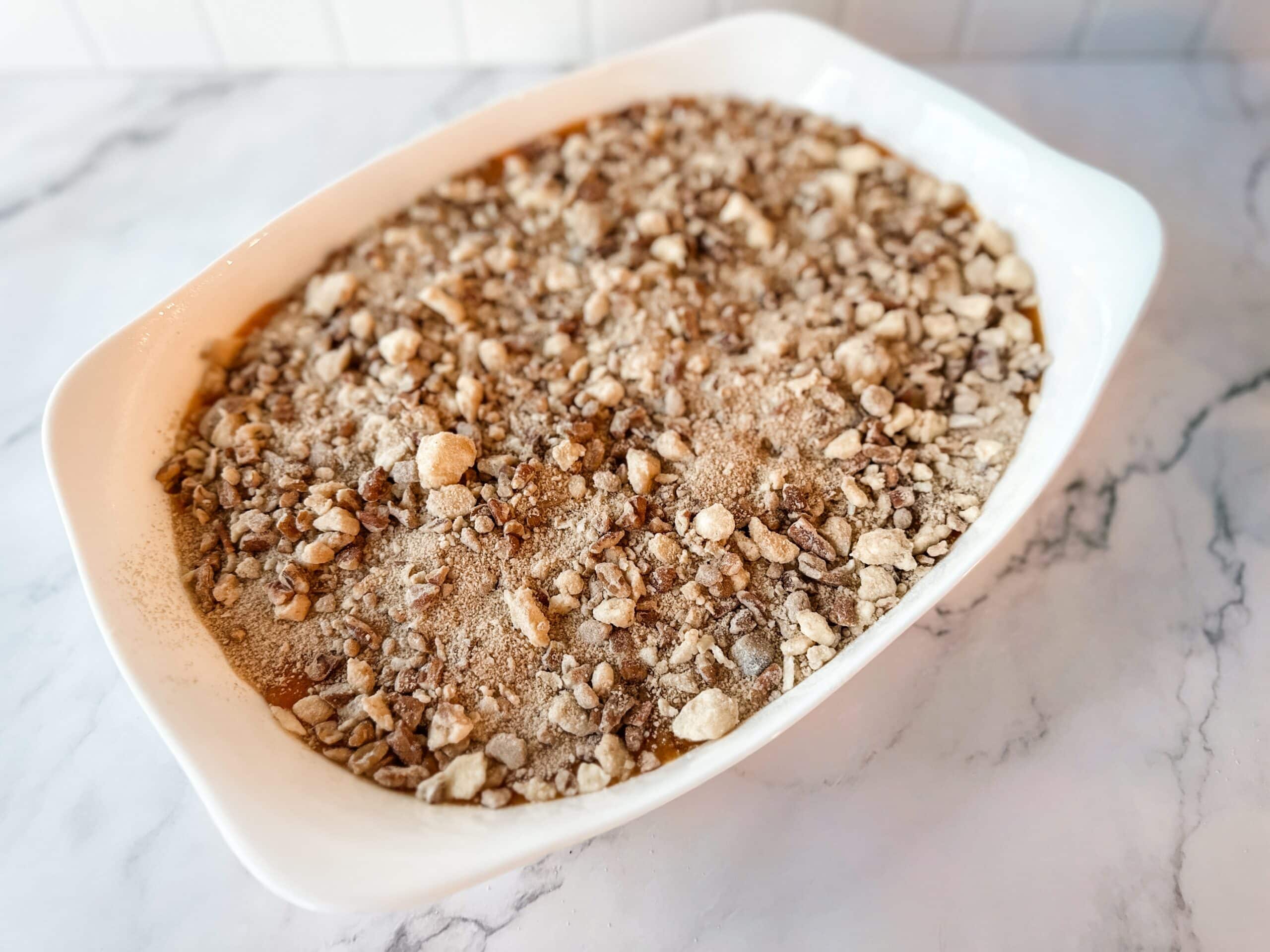 This streusel topping is a family favorite here because it is just so delicious. The chopped pecans add a little crunch and perfectly compliment the sweet potatoes.