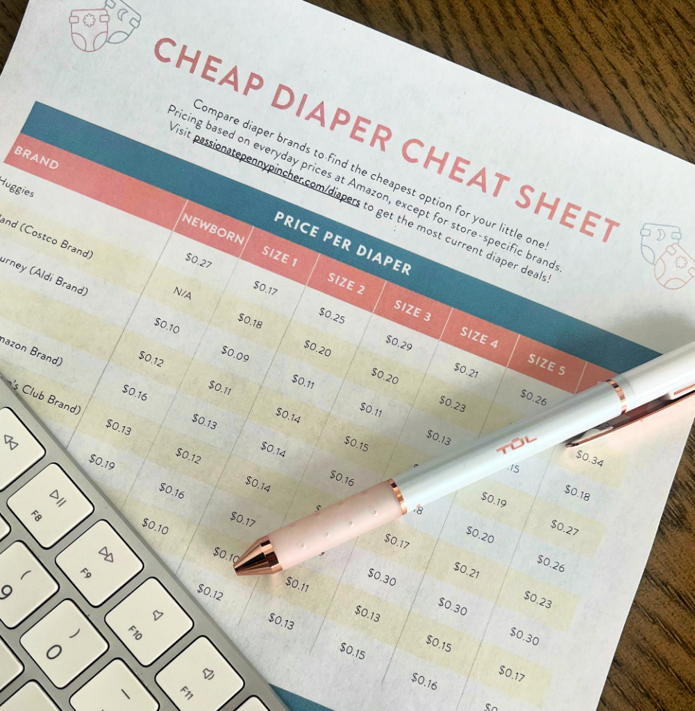 🧷🧷=> Make sure to print out the Cheap Diaper Cheat Sheet Here for a comparison of diaper prices by brand 🙂