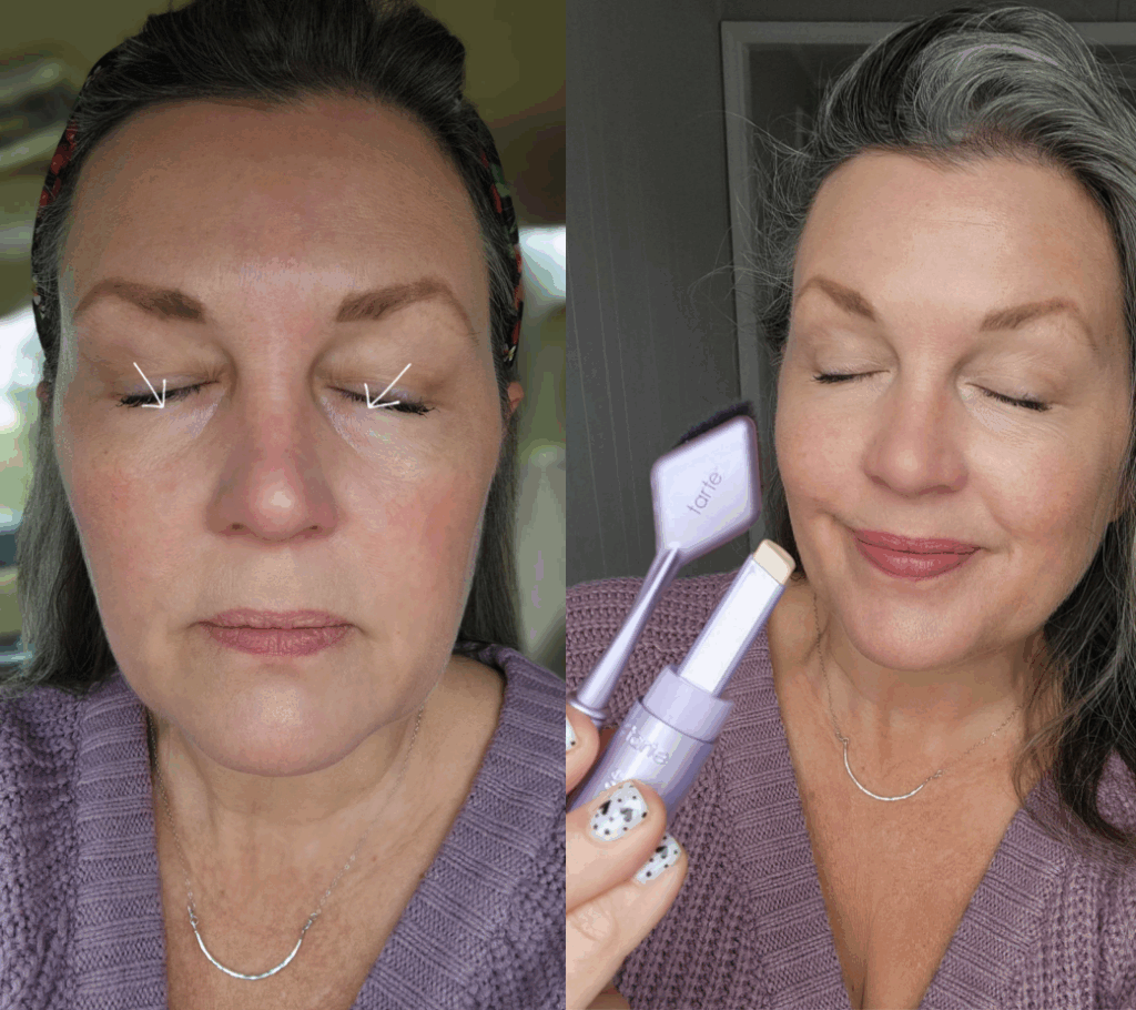 Y’all…. IT IS FANTASTIC. My undereyes always look bruised (See the before photo on the left), plus the skin is crepey and crinkly, so concealers always sit in the creases really badly. The Tarte Blur Stick is made for maturing skin like mine and the specially contoured brush lets you gently brush it into the hollows under your eyes. I honestly think it’s the best concealer I’ve tried with my older skin. I’ve had it on for a few hours now, and it’s still looking good. Brightens and blurs and doesn’t feel heavy or cakey. Love!