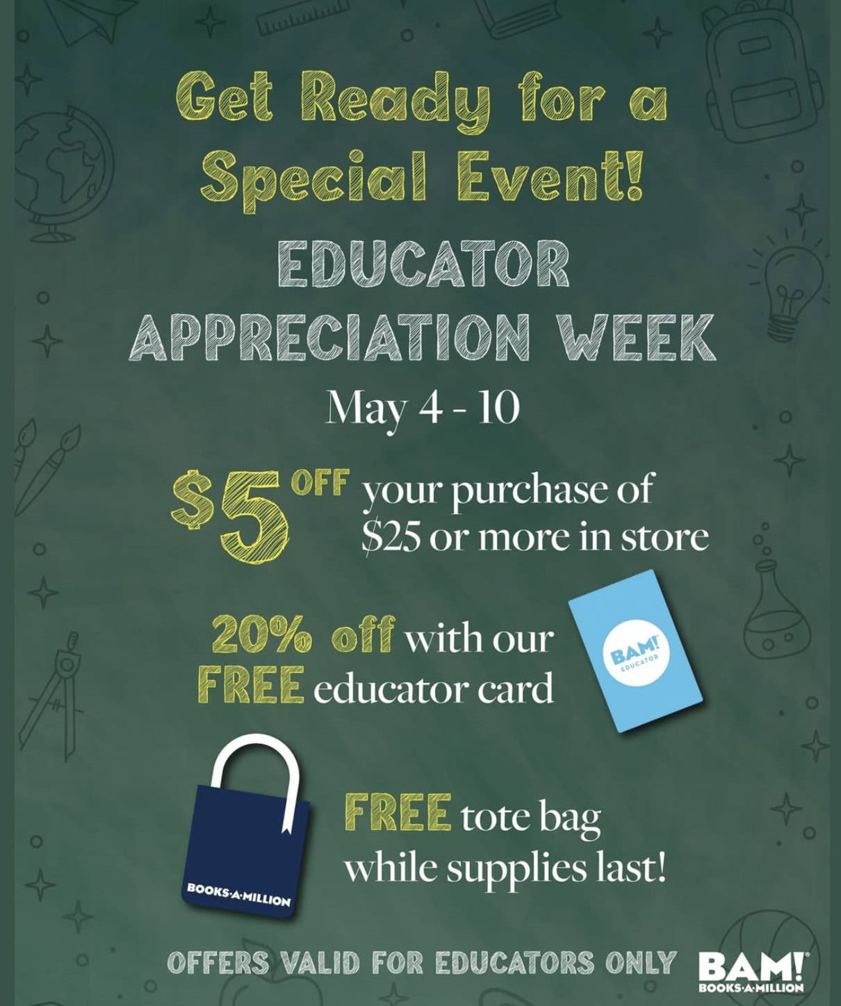 Educators will receive $5 off their $25 purchase May 4-10, 20% off with their FREE Educator Card, and a FREE tote bag.