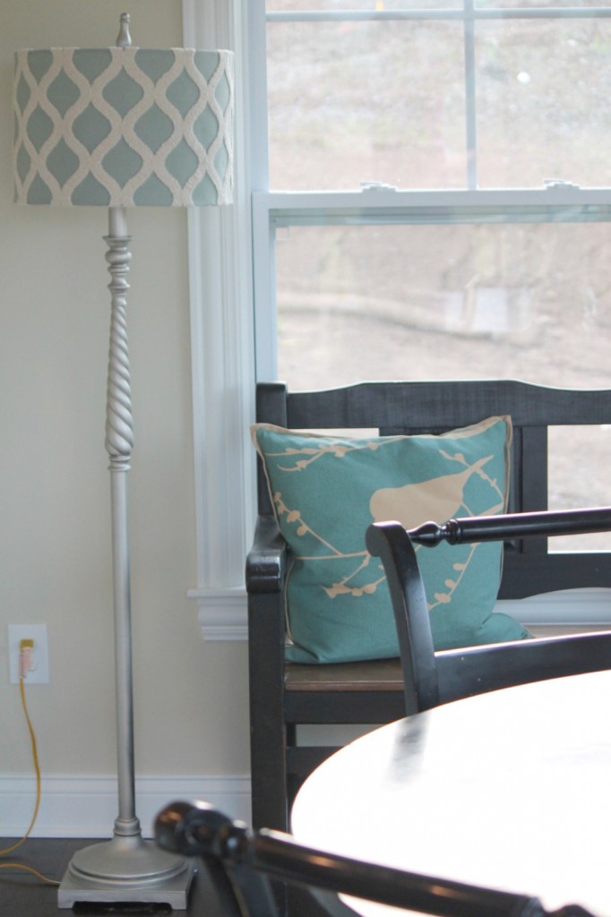 The best change we made was this lamp in the corner (I’m so much happier with it!) It originally had this shade on it, but at the Ballard Design Outlet I fell in love with the blue shade above (on sale for $21 ~ had been $69.) I grabbed it but knew I needed to update the base of the lamp, so grabbed a can of spray paint yesterday at Hobby Lobby and in about five minutes that project was done.