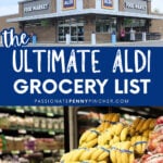 If you’re wondering what to buy at Aldi, this Aldi Grocery list walks you aisle by aisle through the store – starting in produce and ending in frozen foods (a kinda-crazy setup that’s unique to Aldi, so hopefully this will make life easier for you.)
