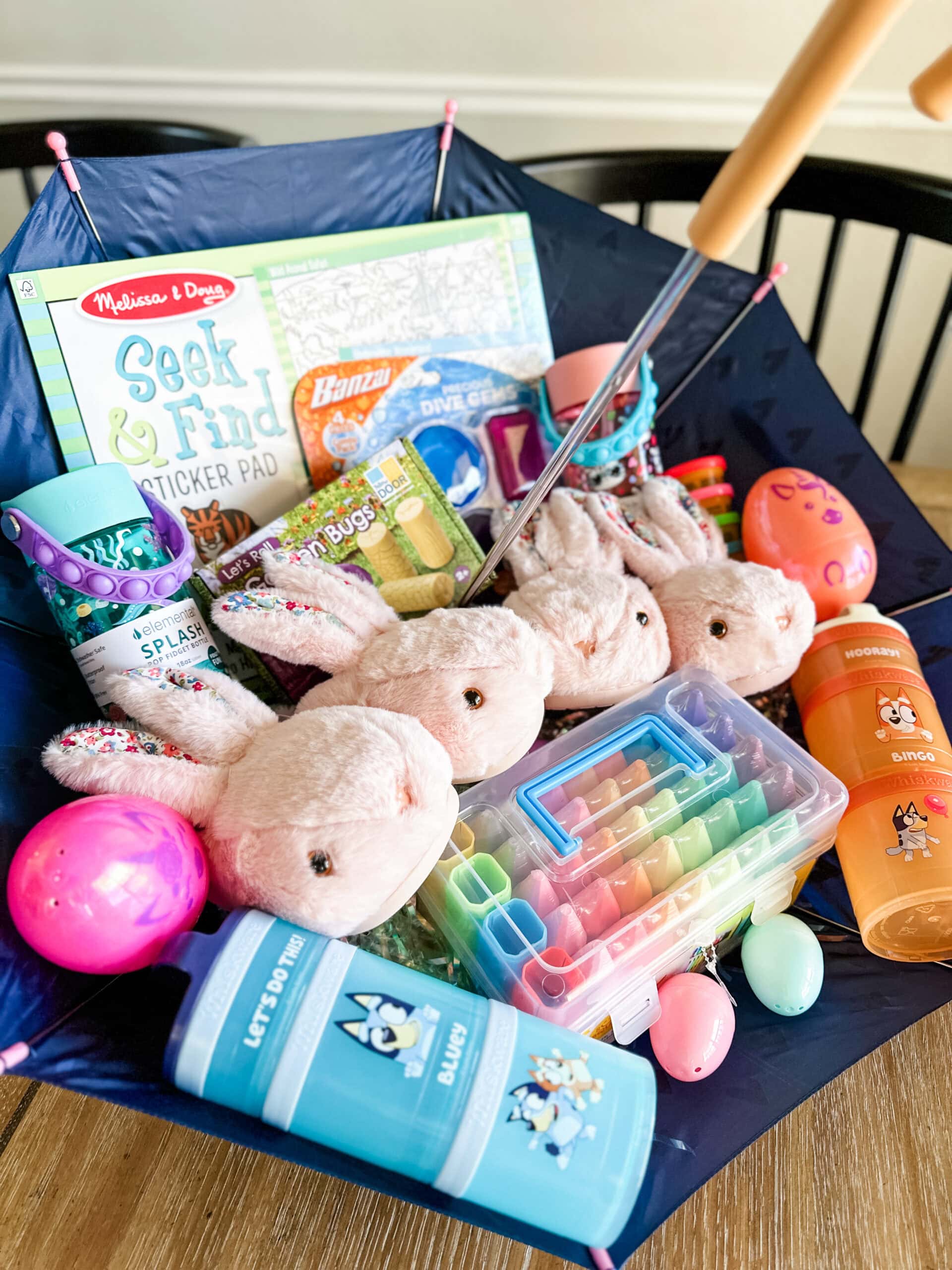 Instead of using a traditional basket this year – why not purchase a cute umbrella and fill it with spring toys and treats instead? It’s a fun way to change things up and surprise the kiddos. (Plus it’s completely practical.)