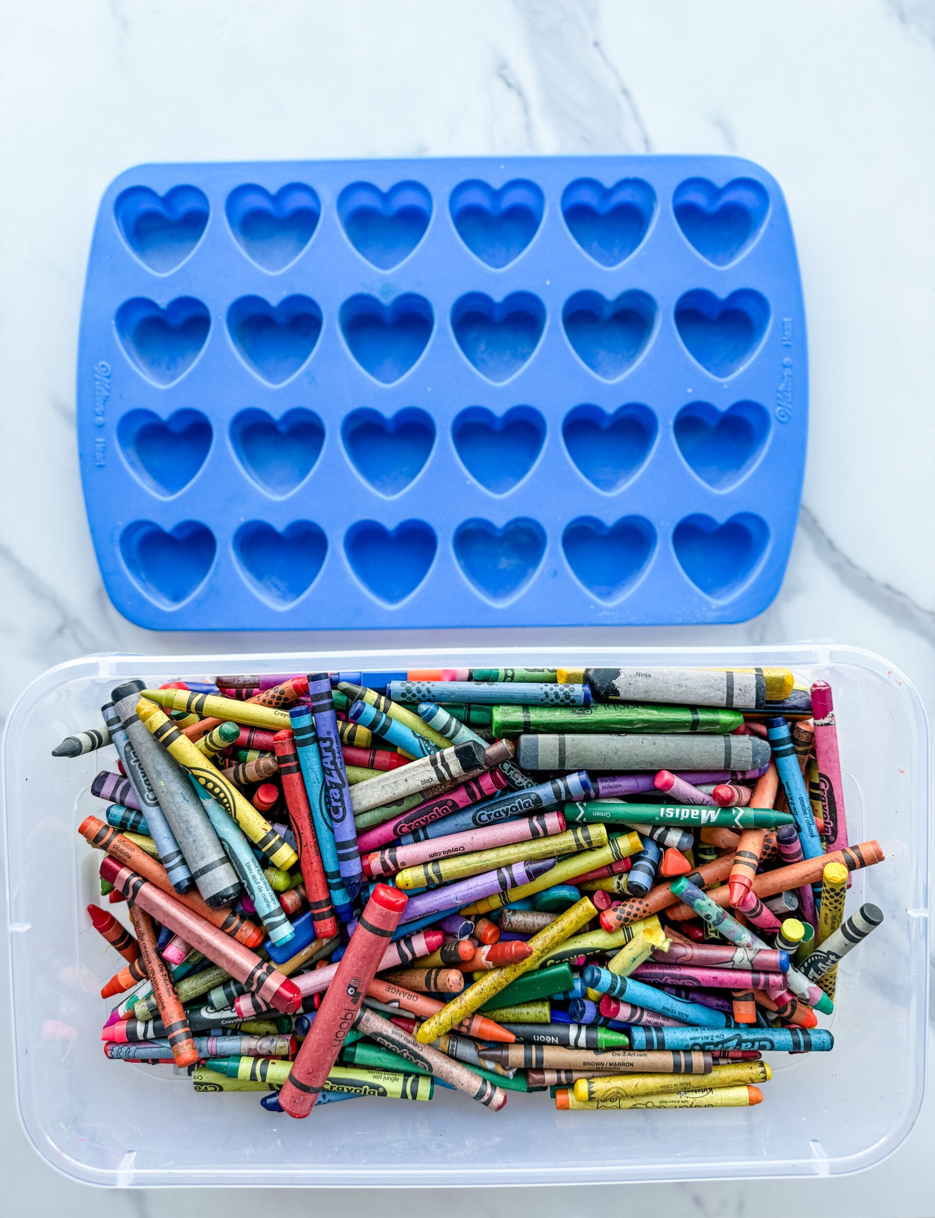 1. Unwrap the paper from the crayons and break them into small pieces to fit into the heart mold.