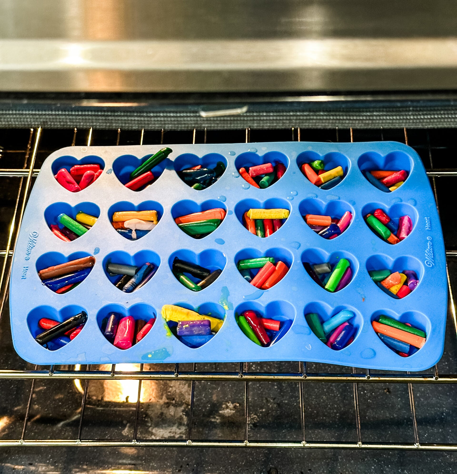 3. Carefully remove the mold from the oven and let the crayons cool completely. The wax can spill easily, so move the mold gently and keep it level. Once cool, gently push from the bottom of the silicone mold to release your crayon hearts.