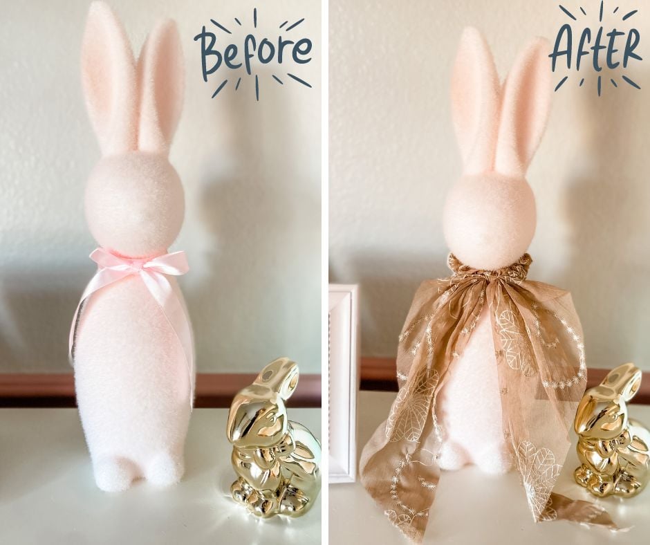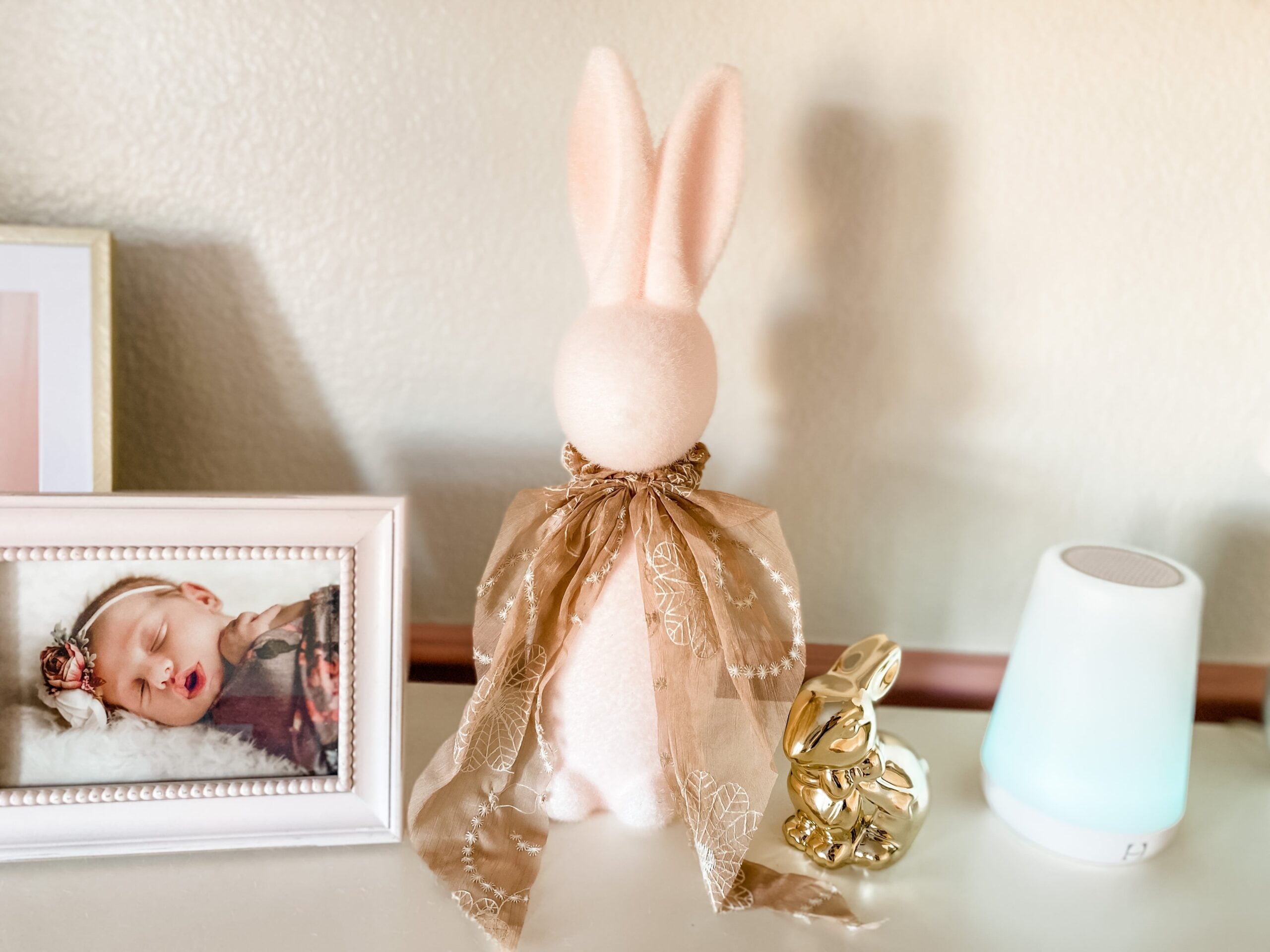 I love these cute Walmart bunnies, but I wanted to take them up a notch with my Easter décor. My daughters’ rooms have a little bit of a boho vibe, and I wanted these bunnies to fit in. So, I grabbed a pretty scarf scrunchie and the light pink bunny and raced home for her makeover!