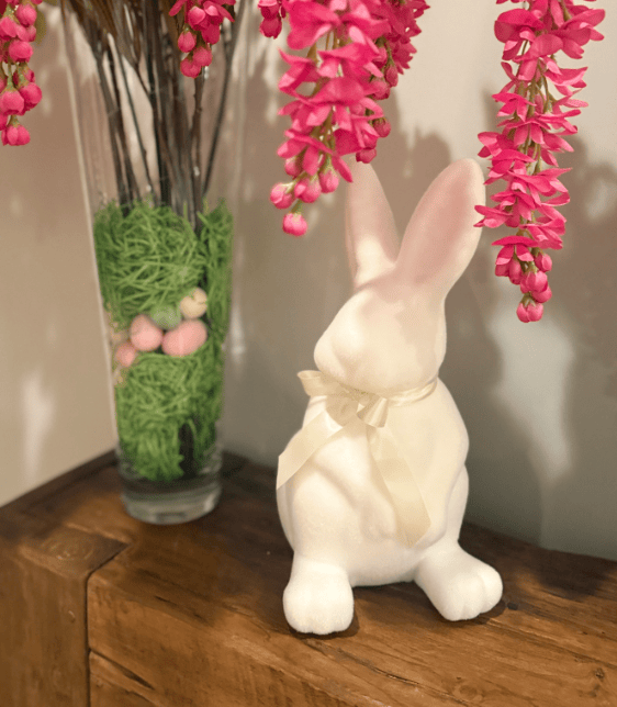 Have you seen these adorable, SUPER popular flocked bunnies at Walmart? They went viral on social media a couple years ago because they’re just too cute – and they’re back again this year. My friend Michelle had them at her house and they looked so cute tucked here and there 🙂