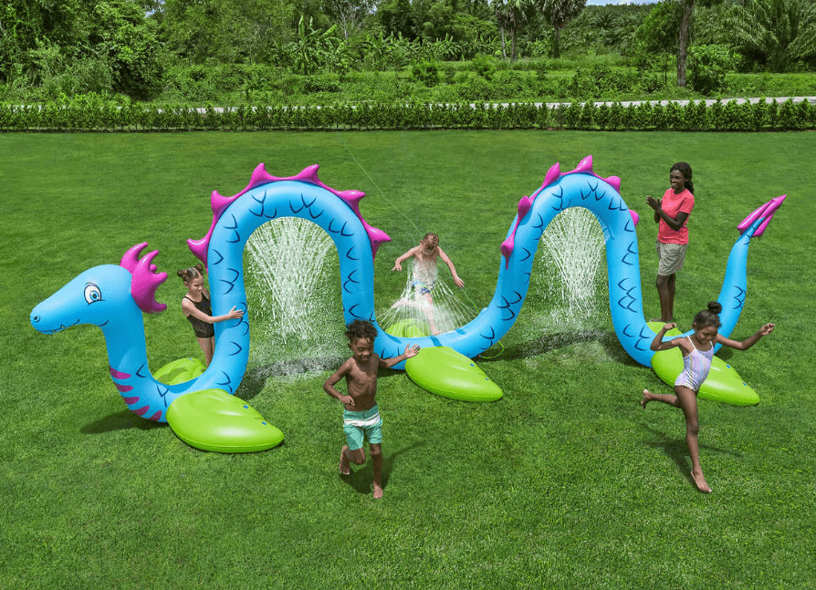 This 20′ Long and 6′ High sprinkler is big enough for two kids to run under the serpent’s sprinkler arches, while another child can leap over the middle dip!