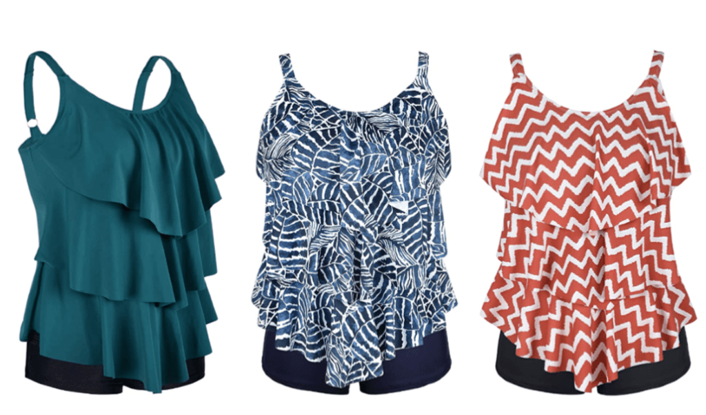 The Septangle Women’s Tankini Set Ruffle Swimwear with Shorts is a cute affordable option. It comes in a whopping 17 patterns – and sizes from 8 – 20 Plus.