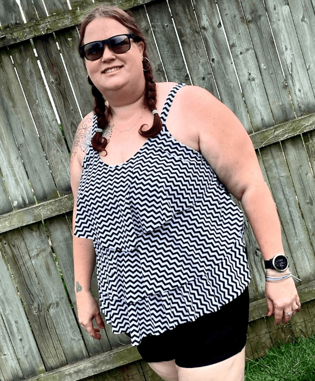 Based on your reviews, I ordered the Septangle Women’s Tankini Set Ruffle swimwear with Shorts. I’m 5’4” and sadly weigh 180 with a big pooch tummy in front. I wanted something to hide the tummy, and disguise my small chest. This suit did that! I got it in a 14, which is too tight, so now I’m sizing up to a 16, and can’t wait to try it on and see how it fits. Thank you so much to Amber for her review and modeling!