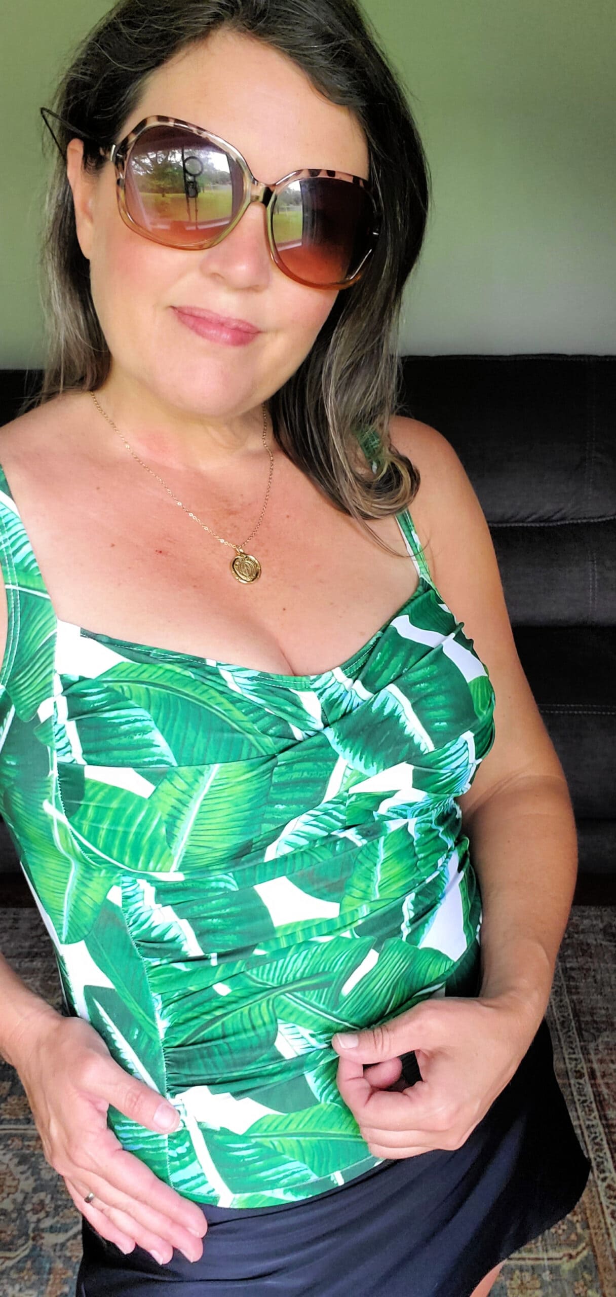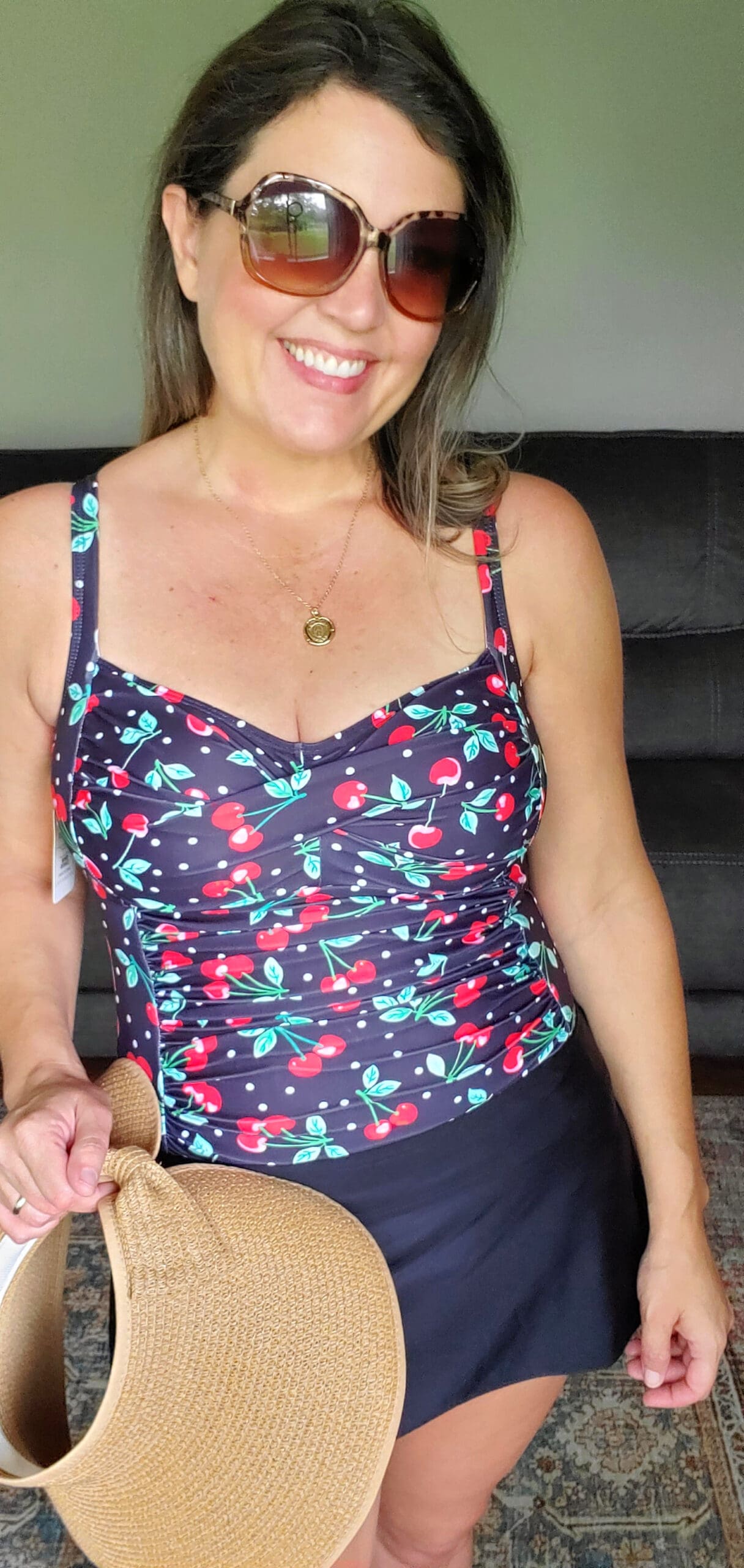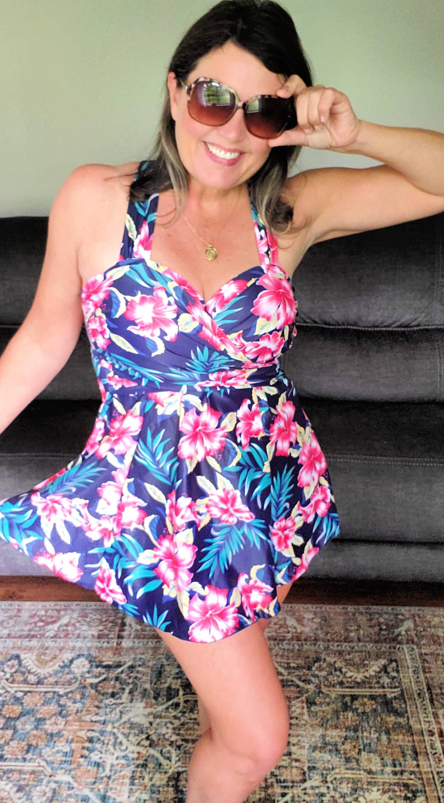 Do you ever put on a swimsuit and just break into a smile? No? Me either! But this one just felt like I put on a cute dress and was fun and flirty 🙂 It had a great length, great support and all sorts of extras. I ordered a Size Medium and it was a perfect fit (I’m 5’4″, 155 lbs, 36DD)