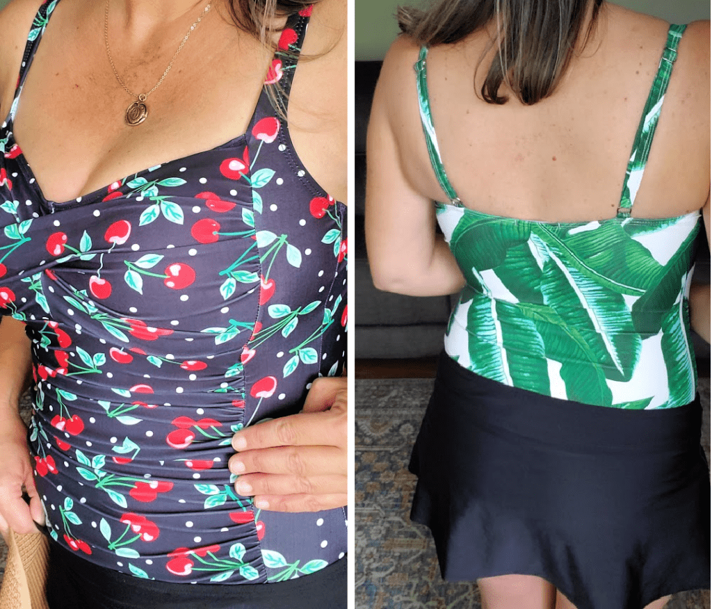 Jamie here…. this Tummy-Concealing One-Piece one is my favorite and the one I ended up keeping! I tried it in a few colors because I had a feeling I’d love it 🙂 The ruching is great for camouflaging trouble spots and the chest support is good. Adjustable straps make it perfect! Here’s another pattern I tried….