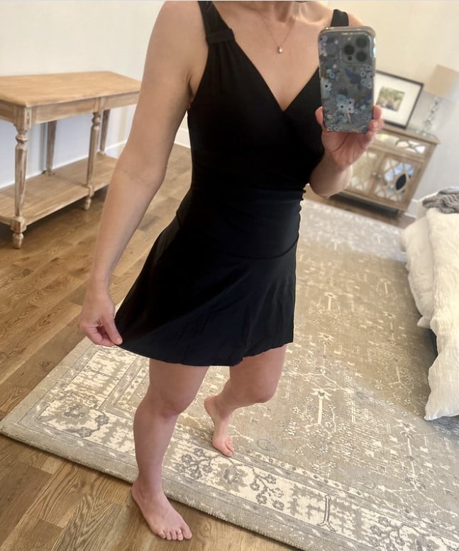 It’s the “little black dress of swimsuits” – literally! You could wear this one while walking around a water park and not feel too exposed. The skirt is just long enough to cover what needs covering. 😉