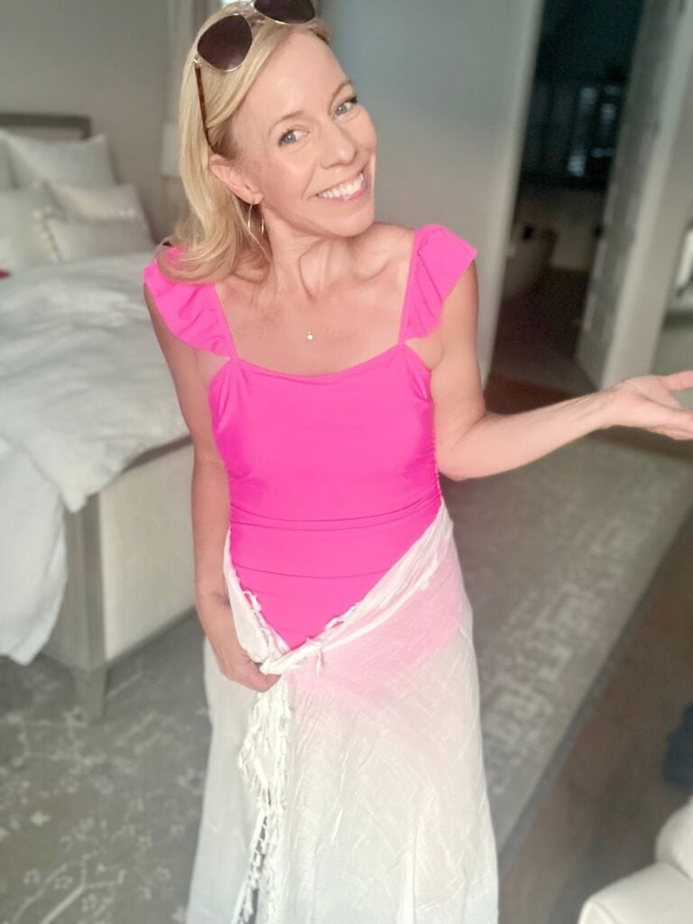 Okay. This pink swimsuit on Amazon is honestly kind of my favorite (I was shocked!) Truth be told, I’m 40++++ years old, and have never ever never worn a bathing suit without a skirt (TRULY. Not one single time in my life!) But this one was just so cute and I loved the bright color so I went for it. Turns out it’s hands down the winner for me!