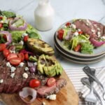 Arrange lettuce, onions, avocados, tomatoes, and sliced steak on platter.