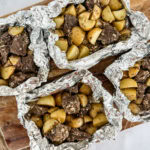 Divide steak and potatoes between 6 (12x12-inch) sheets of foil, then wrap foil tightly around the contents to form foil packets.