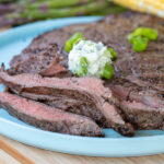 Grill steak 6-8 minutes per side or to desired degree of doneness. Let rest 10 minutes before slicing thinly across the grain. Serve with a dollop of the gourmet butter.