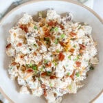 In a large bowl, combine sour cream, mayonnaise and pepper. Add potatoes, bacon, cheese and green onions, reserving a bit of cheese, onions and bacon to garnish the top of the potato salad.