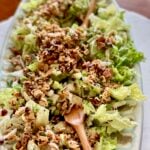 Slice cabbage into bite size pieces. Place on a serving platter and toss with sliced green onions. Set aside.