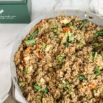 Return pork to skillet, add quinoa and frozen vegetables.