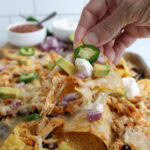 Layer half of tortilla chips, chicken, beans, and cheese in pan to make nachos.